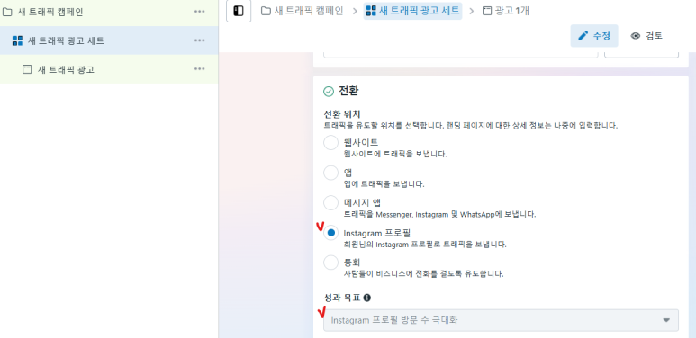 대신 인스타그램(메타) 전환 광고를 하셔야 합니다.