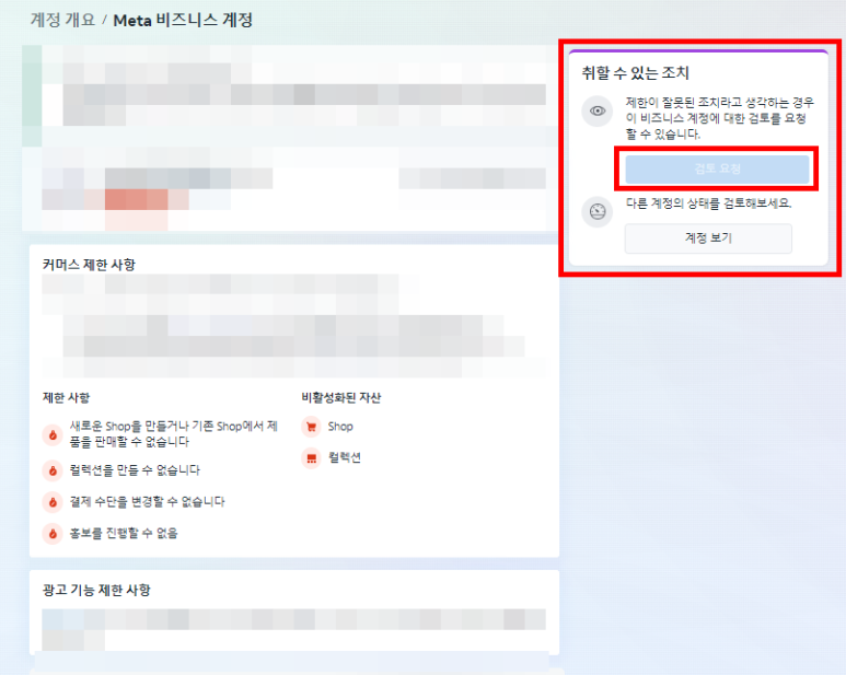 메타 광고 시스템 상 유일한 해결 방법은 검토 요청 뿐입니다.