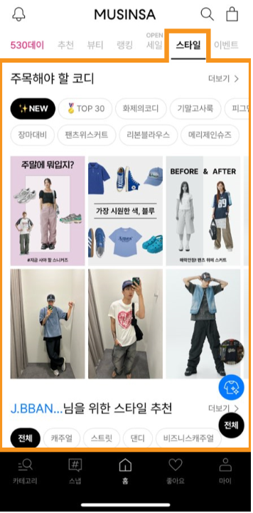 무신사 상단 메뉴의 '스타일' 섹션입니다.