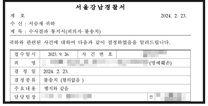 올 해 초, 불송치(혐의없음) 결정을 통해,