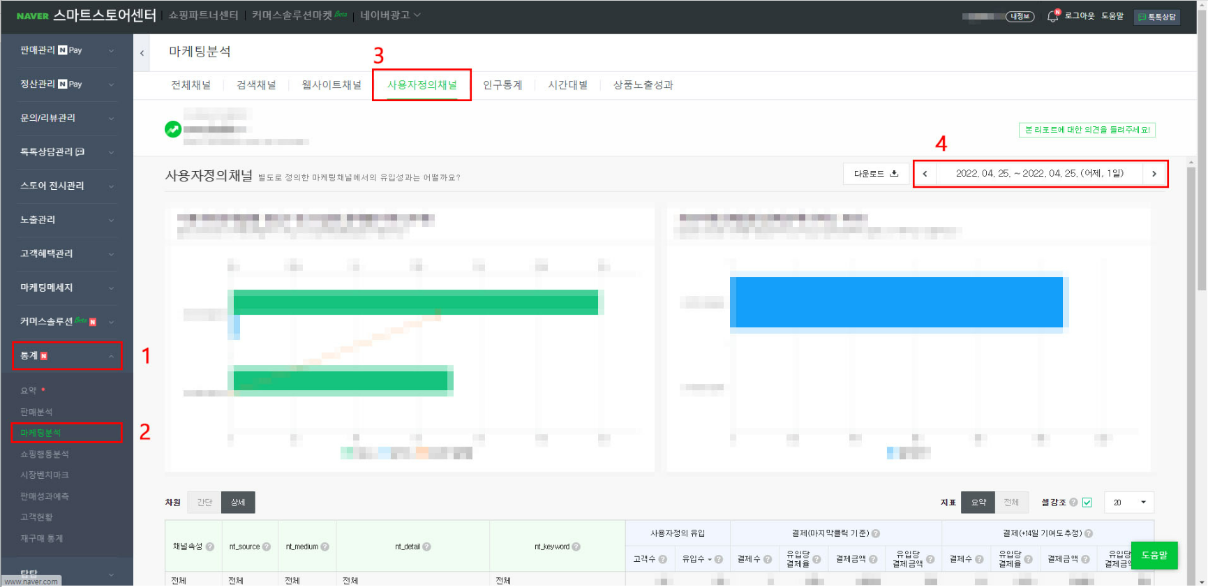 스마트스토어센터 로그인 후,통계 > 마케팅분석 > 사용자정의채널에서 광고 성과를 확인하고 관리해주시면 됩니다.