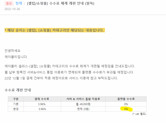 12월 1일부터 [결제수수료] 3.96%(vat 별도), [판매수수료] 3%(vat 별도)로 변경 예정입니다.