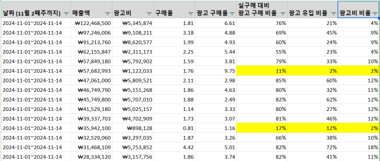 광고 구매 비율(전체 구매 대비 광고 구매)은 50~80%로 훨씬 더 높게 형성되있는 것을 확인할 수 있습니다.