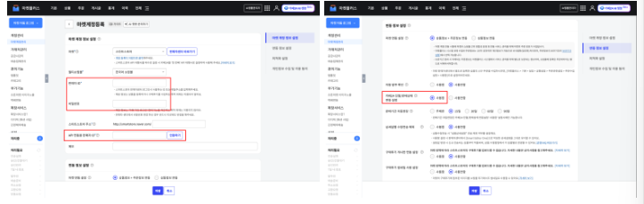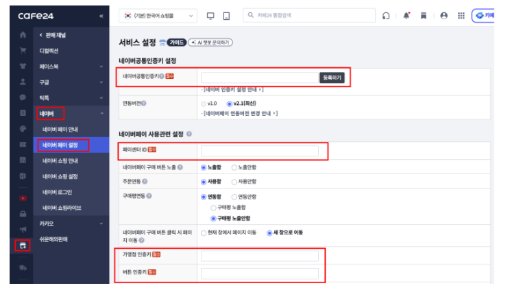 여기서 페이센터 ID, 가맹점인증키, 버튼인증키, 네이버공통인증키를 체크하고