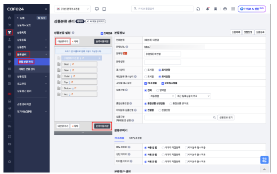 카페24 관리자 페이지 왼쪽 '상품' → '분류 관리' → '상품 분류 관리' 클릭해주시면