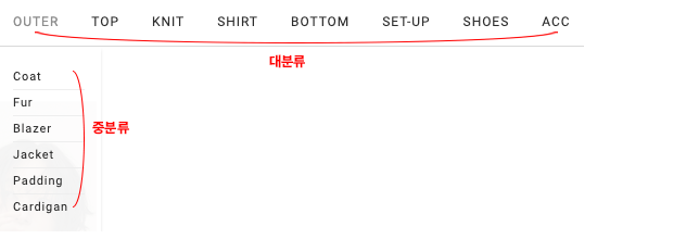 대분류 → 아우터 / 상의 / 하의 / ACC 같이 크게 나누고