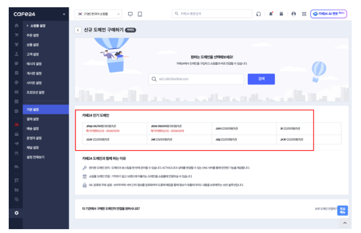'기본 설정' → '도메인 설정' → '신규 도메인 구매하기' 클릭