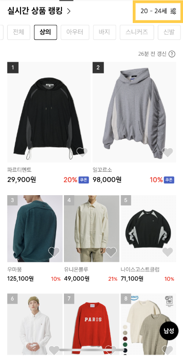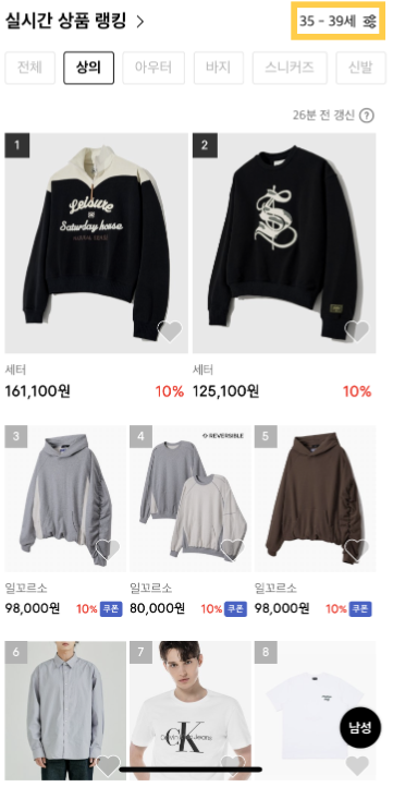 무신사에서 가져온 나이대별 베스트 상품입니다.