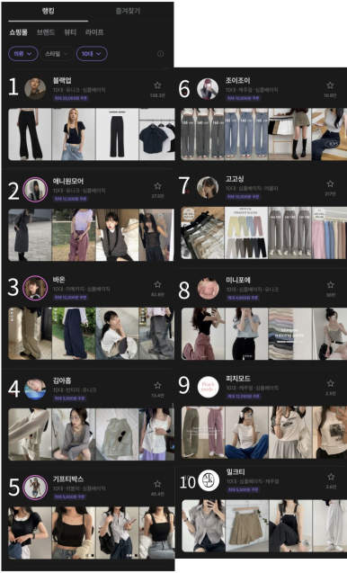 지그재그의 나이대별 스토어 랭킹입니다.스토어 → 랭킹 → 의류 → 연령대를 체크하면상위권 쇼핑몰을 확인하실 수 있습니다.순위는 조금씩 다르지만,