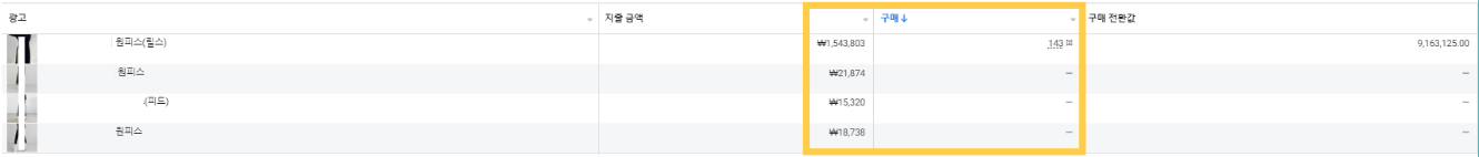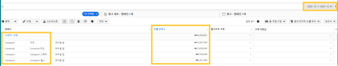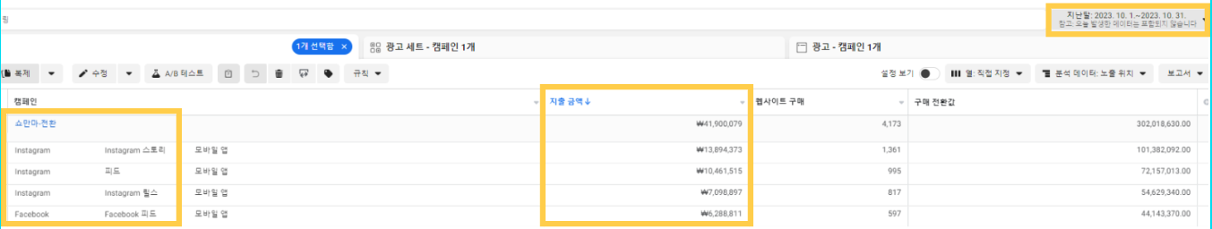 작년에는 메타 광고 업데이트 탓에 광고영역별 구매수를 볼 수 없었습니다. 하여 지출금액으로 비교했습니다.)