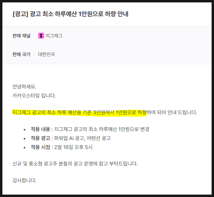 바로 지그재그 파워업ai광고의 "일일 최소 예산"이 3만원 → 1만원으로 하향된 것입니다!!!