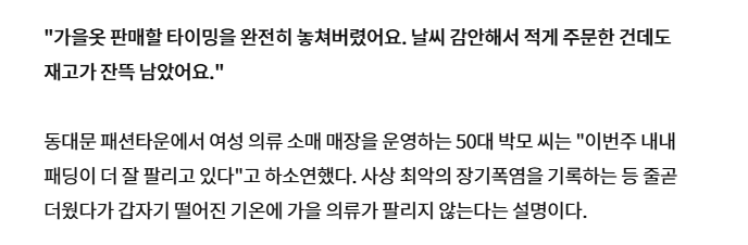 "재고는 어쩌나…" 뜻밖의 상황에 동대문 사장님들 '발칵', '가을은 멋 부리기 좋은 계절' 옛말 "집에 있는 가을옷도 못 입을 판" 동대문 소매 상인 "가을옷 주문 줄였다" 대신 월동 준비 빨라진 분