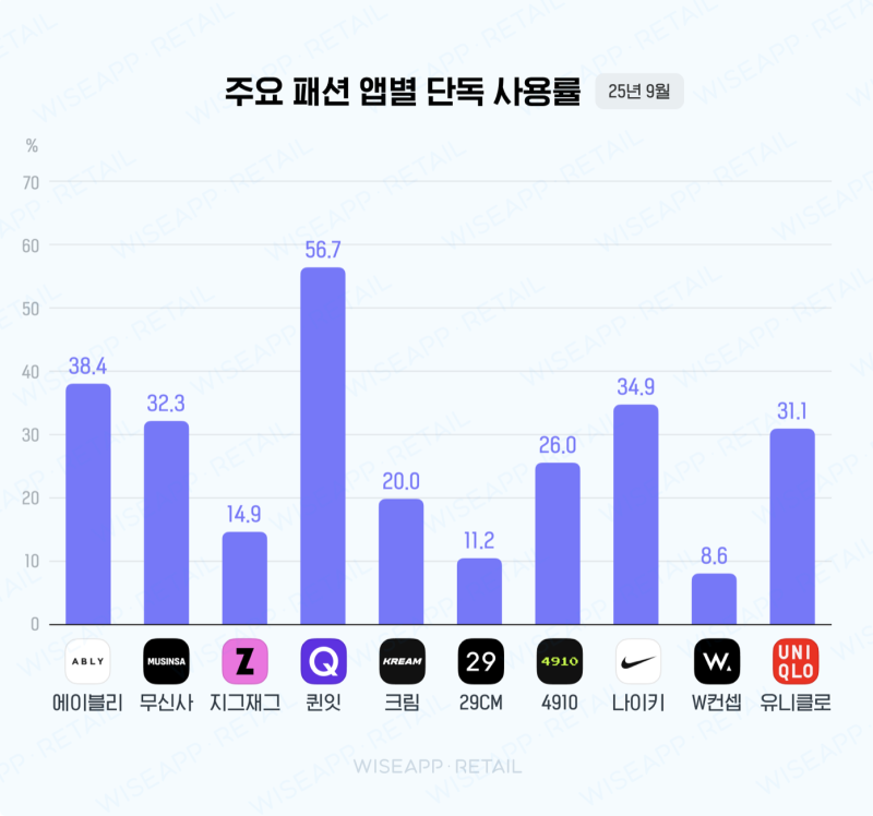지그재그, 29CM, W컨셉은 단독 사용률이 8~15% 정도로 낮은 편입니다.