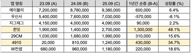 사용자 수 1등은 에이블리, 사용자 수 증가 추세가 가장 강한 건 퀸잇과 4910 입니다.