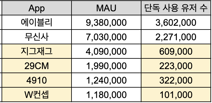 단순 계산을 해보면 지그재그, 29CM, 4910, W컨셉의 단독 유저 수는 100만명도 채 안되는 수준입니다.