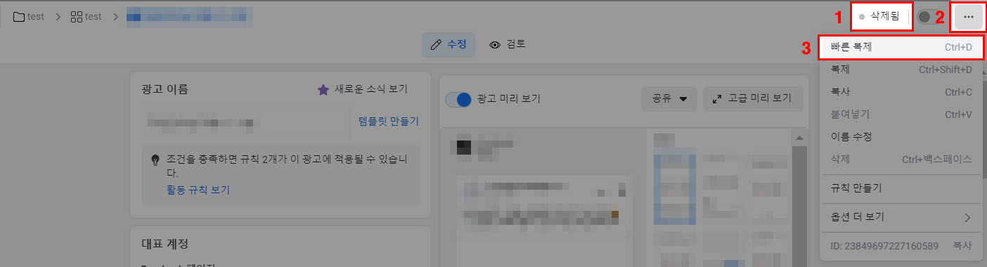 6. 이렇게 하면 삭제했던 광고와 동일한 설정의 광고를 생성할 수 있습니다.
