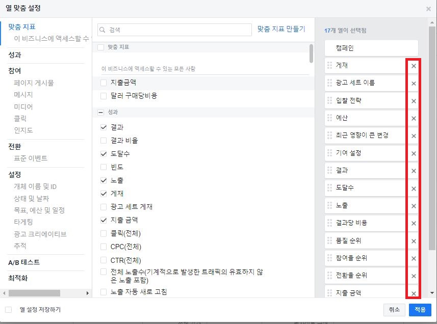 3. 열: 성과를 클릭한 후 맨 아래 '열 맞춤 설정'을 눌러주세요.