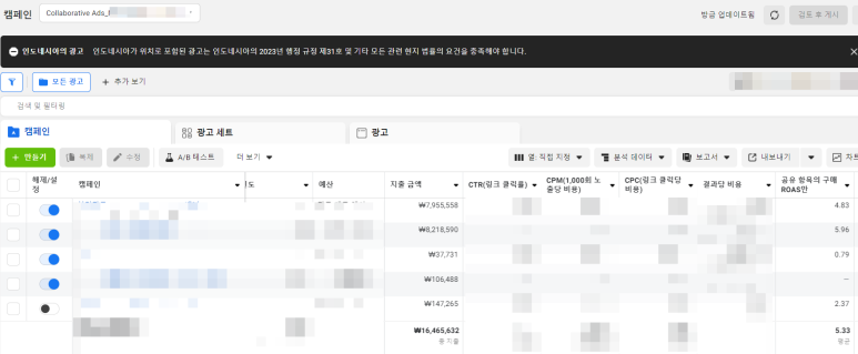 ROAS를 포함한 모든 광고지표가 말도 안되게 효율이 좋습니다.