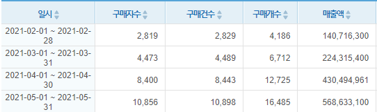 월 매출 1억 대 이상만 놓고 보면 20개~25개 정도입니다. (10억 대 이상은 40개 이상)
