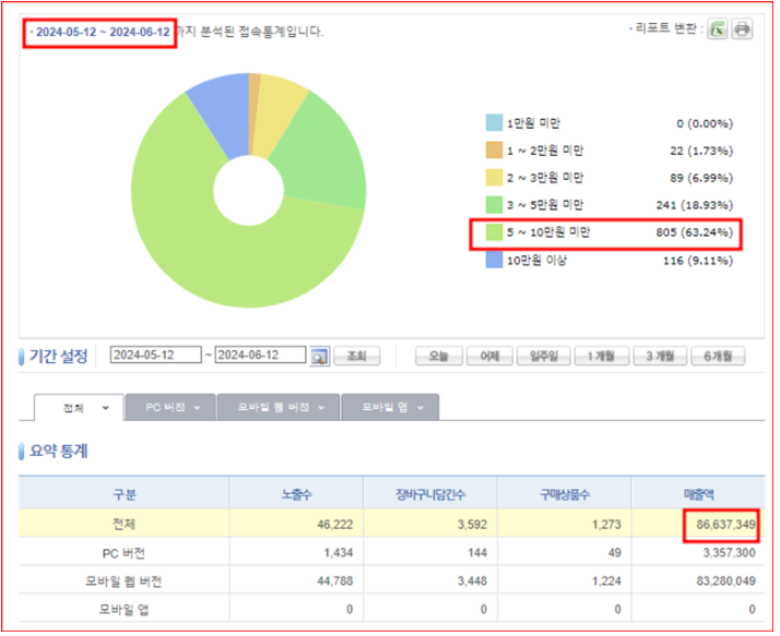 5~10만원대 상품군의 매출이 60%가 넘습니다.