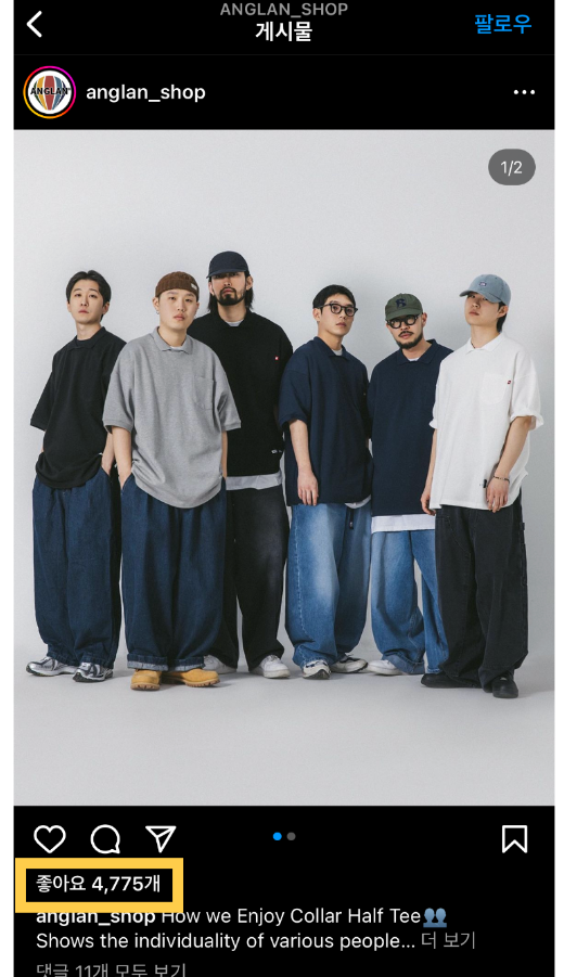 하루 간격으로 올라간 피드의 좋아요 수가 10배, 20배 차이나는 것을 보실 수 있습니다.
