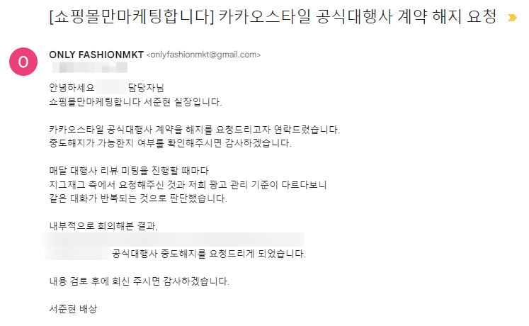 정확한 공식대행사 계약 해지 사유는 상호간의 비밀유지 의무가 있어 말씀드릴 수 없지만,