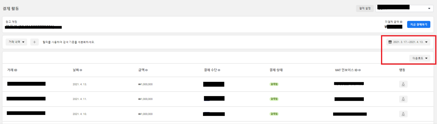 (2) '청구서'로 이동 ▶ business.facebook.com/ads/manager/billing_history/summary/