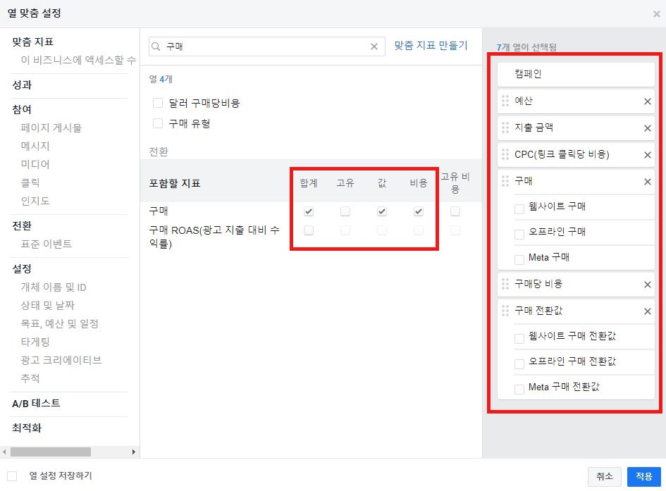 8. 사진과 같이 웹사이트, 오프라인, META 구매는 전부 체크 해제 후